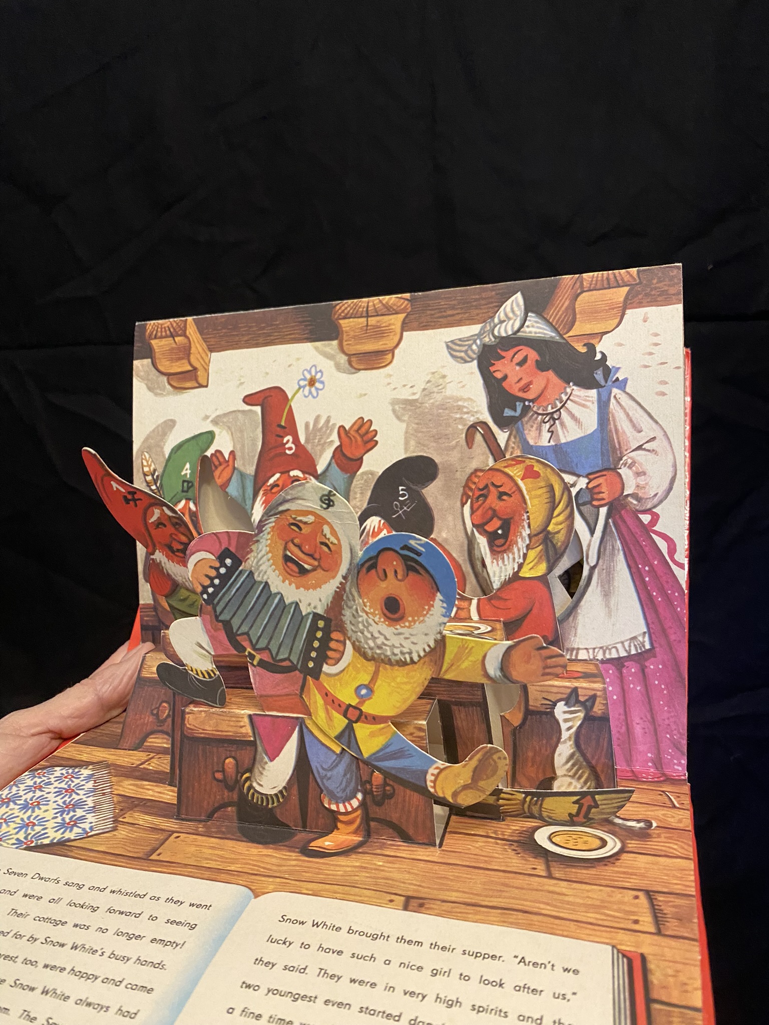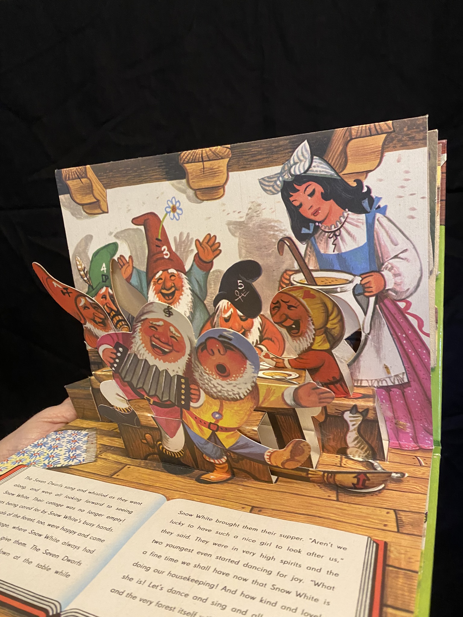stage-like scene with simple 90 degree folds. The drawings are cute, and the story is nice - the dwarves are friends with the animals, every one